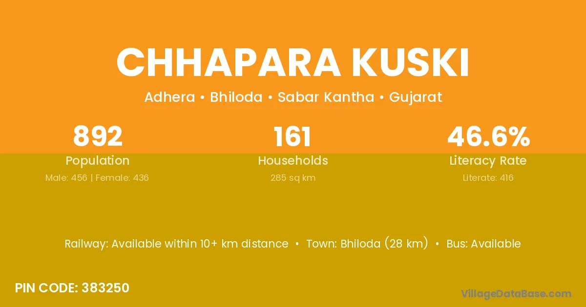 Bhiloda (28 km) is the nearest town to Chhapara Kuski village for major economic activities and is located approximately 28 km away.