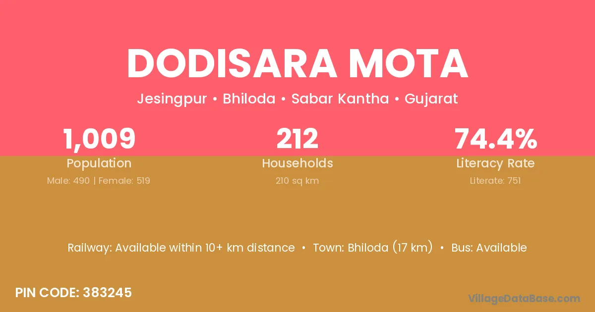 Bhiloda (17 km) is the nearest town to Dodisara Mota village for major economic activities and is located approximately 17 km away.