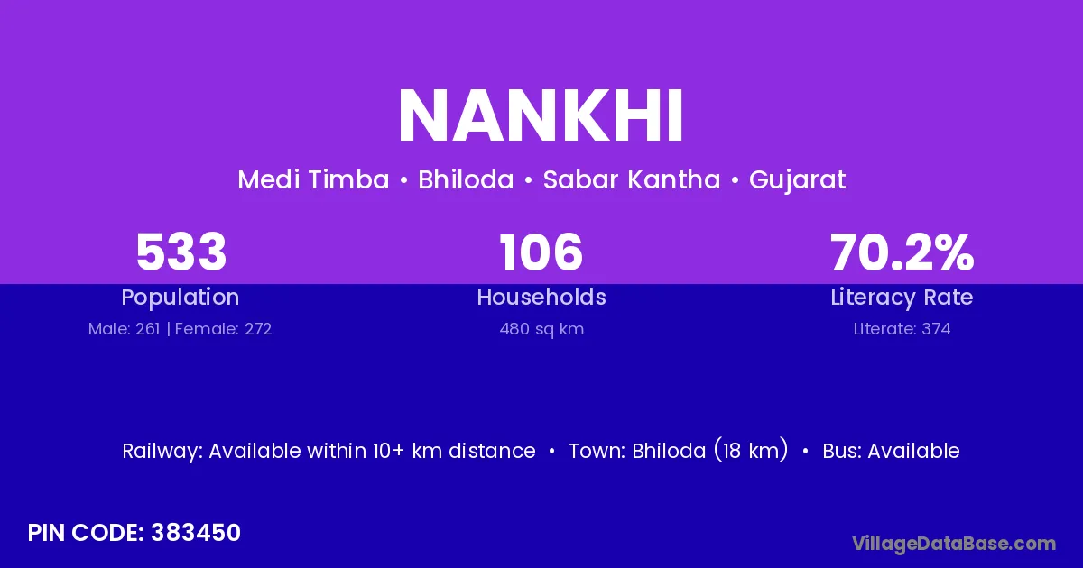 Bhiloda (18 km) is the nearest town to Nankhi village for major economic activities and is located approximately 18 km away.