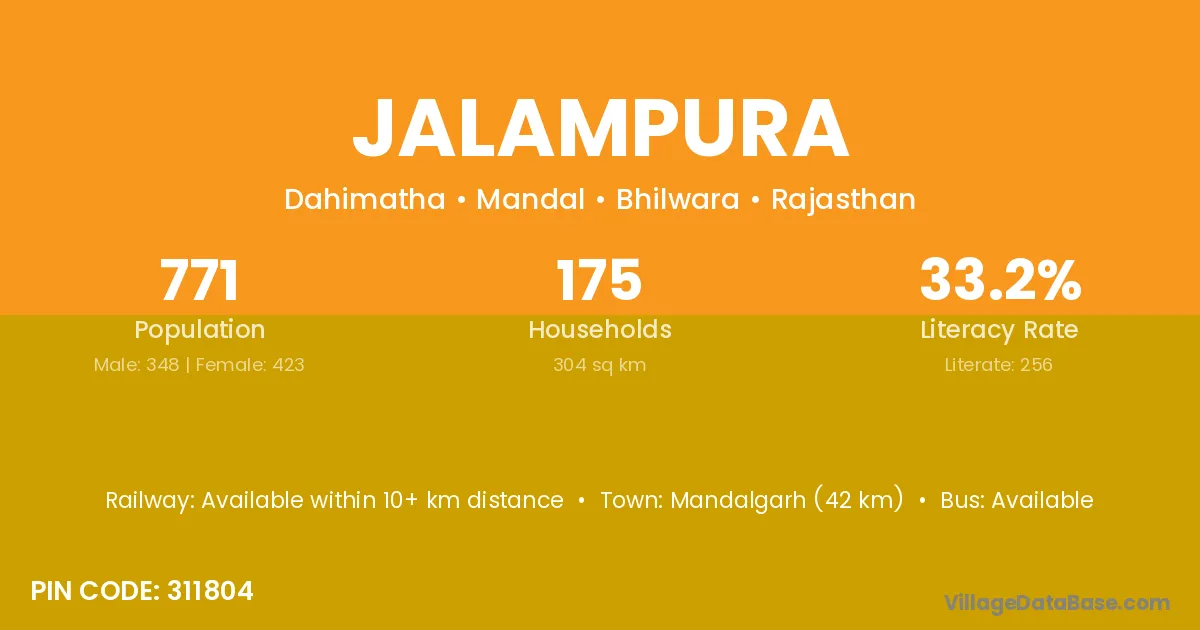 Modasa (36 km) is the nearest town to Jalampura village for major economic activities and is located approximately 36 km away.