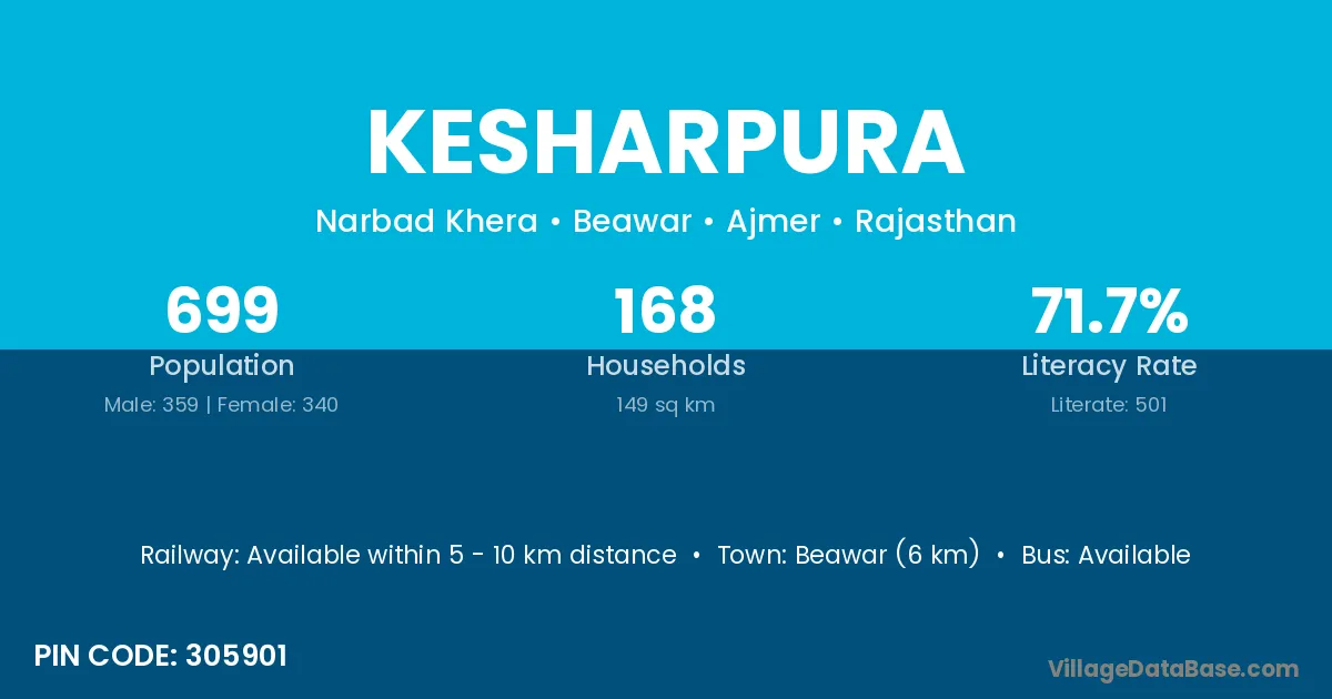 The literacy rate of Kesharpura village is 58.67%. Male literacy stands at 66.00% and female literacy at 51.04%.