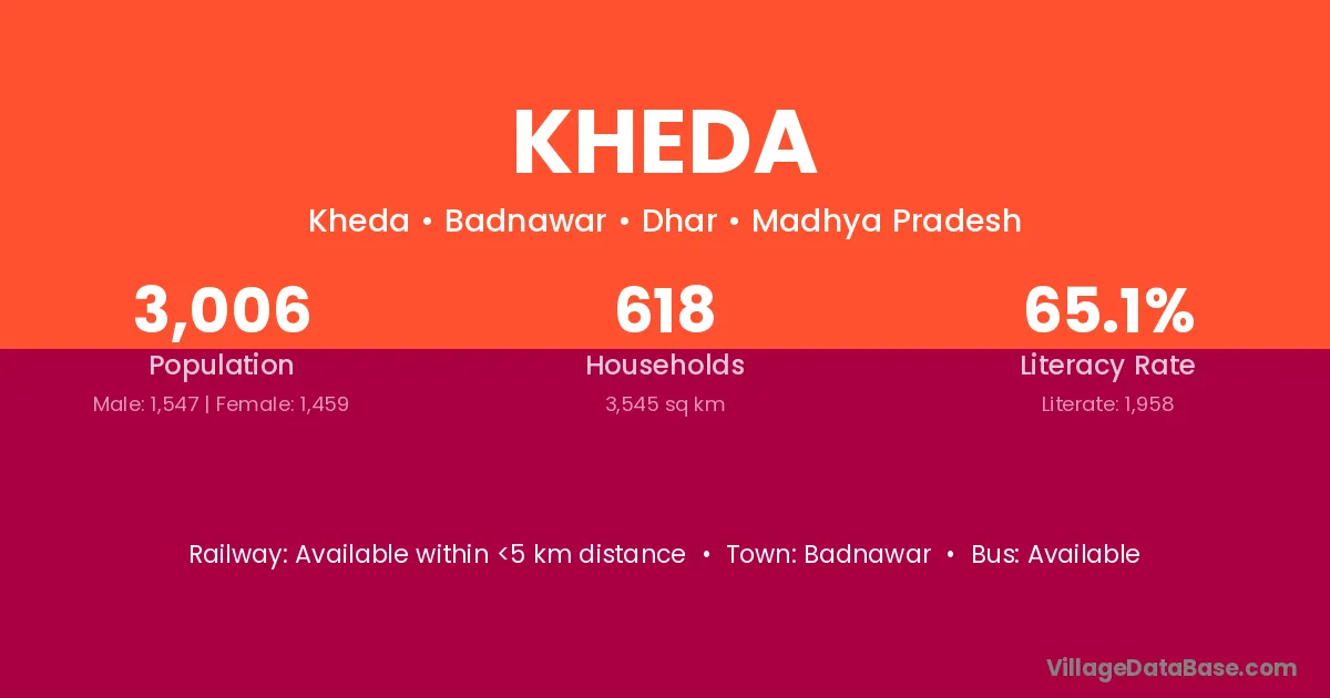 Modasa (28 km) is the nearest town to Kheda village for major economic activities and is located approximately 28 km away.