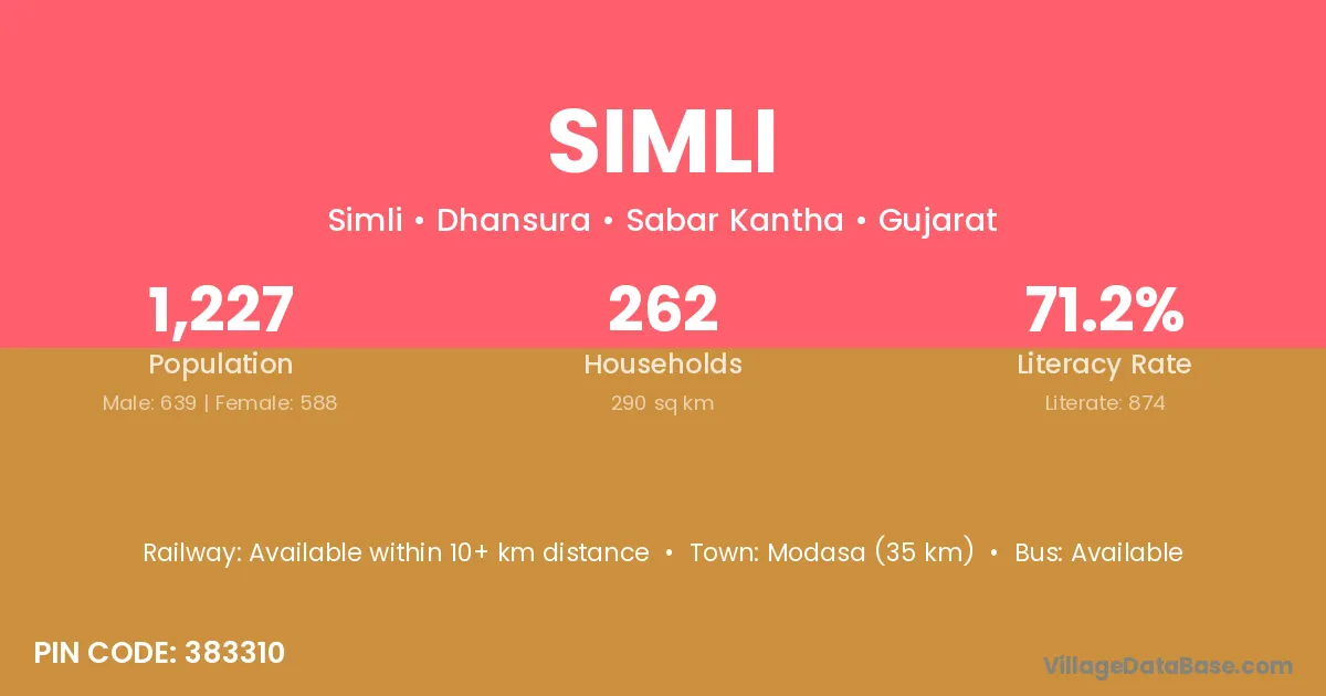Modasa (35 km) is the nearest town to Simli village for major economic activities and is located approximately 35 km away.