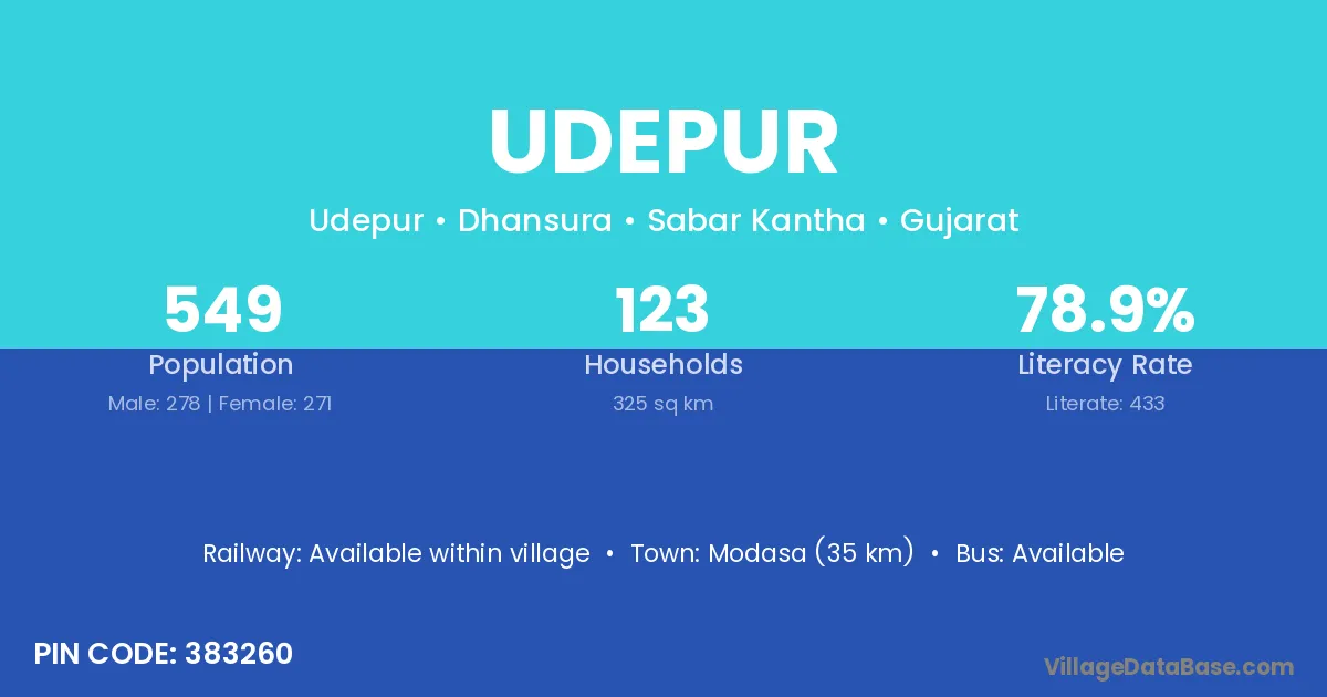 Modasa (35 km) is the nearest town to Udepur village for major economic activities and is located approximately 35 km away.