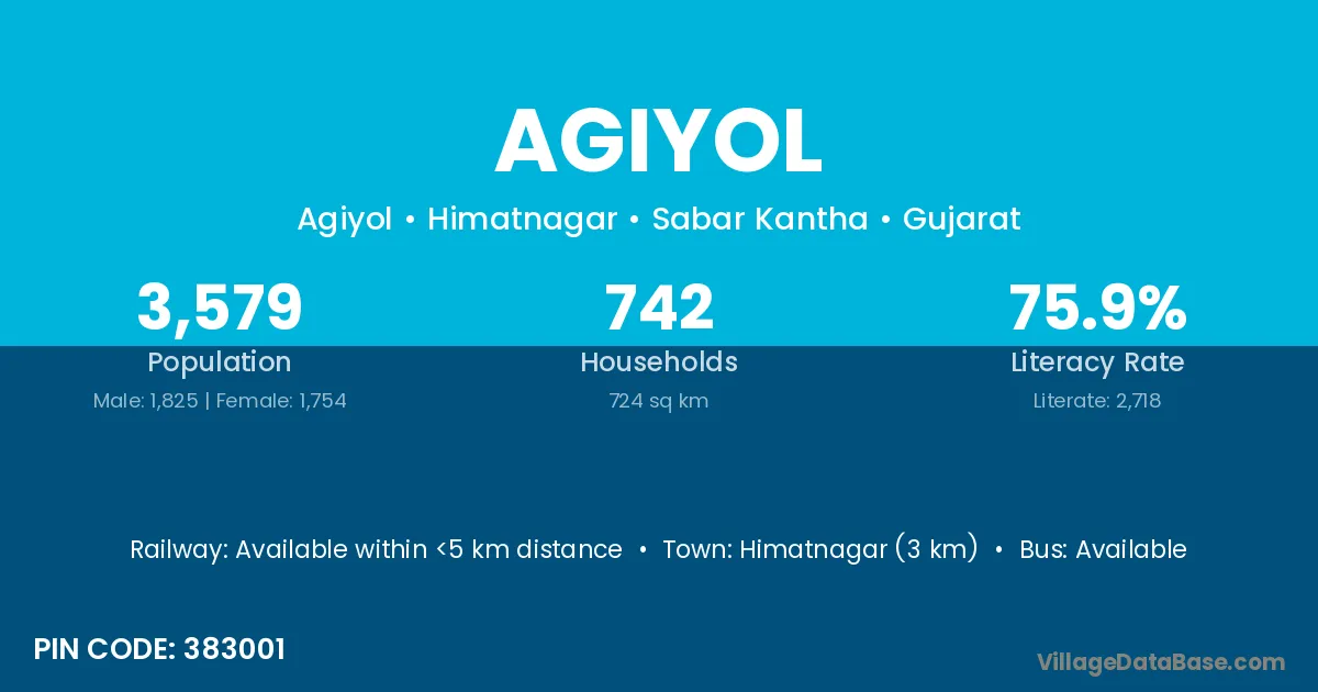Himatnagar (3 km) is the nearest town to Agiyol village for major economic activities and is located approximately 3 km away.