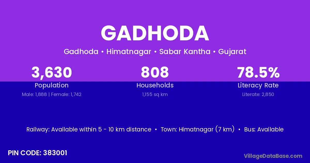 Himatnagar (7 km) is the nearest town to Gadhoda village for major economic activities and is located approximately 7 km away.