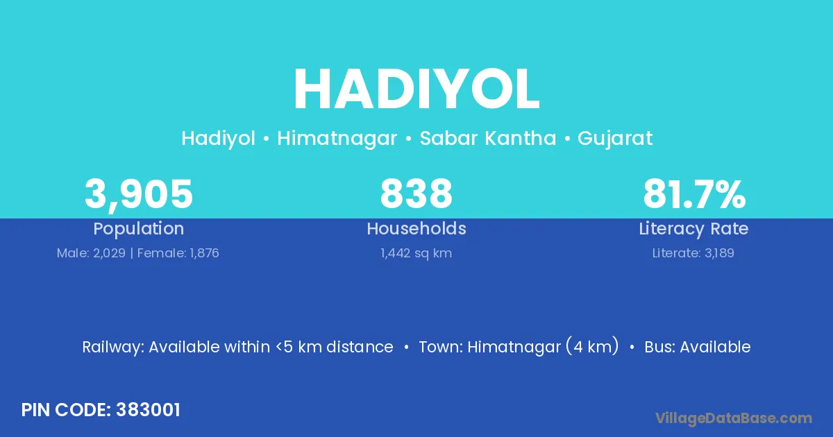 Himatnagar (4 km) is the nearest town to Hadiyol village for major economic activities and is located approximately 4 km away.