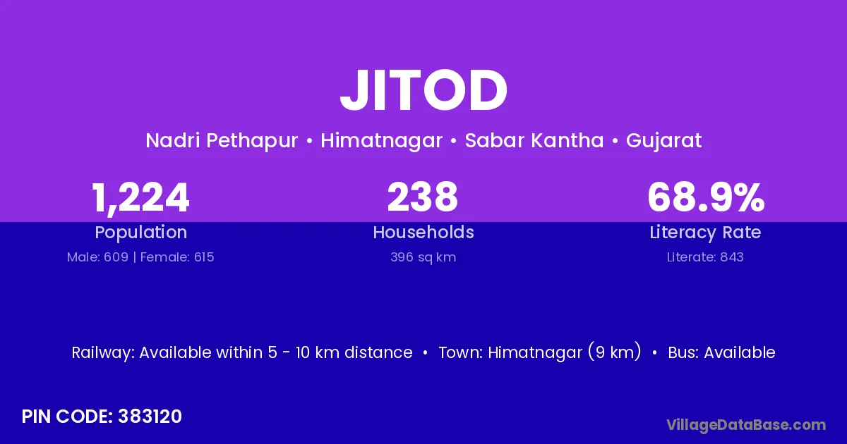 Himatnagar (9 km) is the nearest town to Jitod village for major economic activities and is located approximately 9 km away.