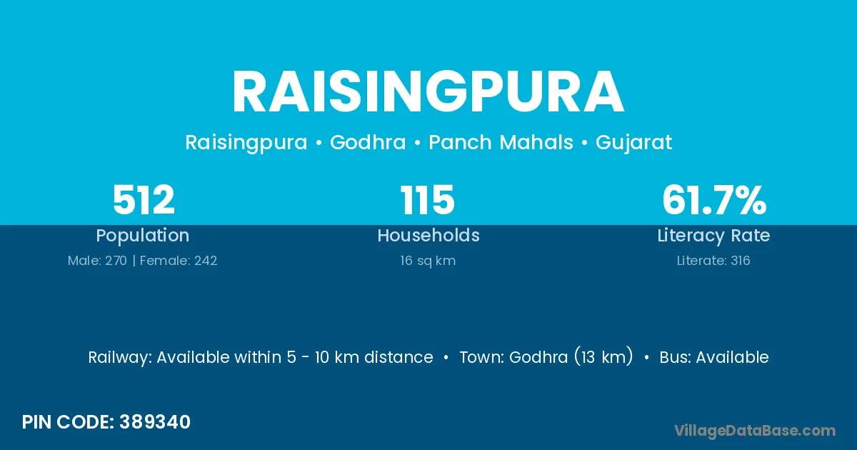 Himatnagar (16 km) is the nearest town to Raisingpura village for major economic activities and is located approximately 16 km away.