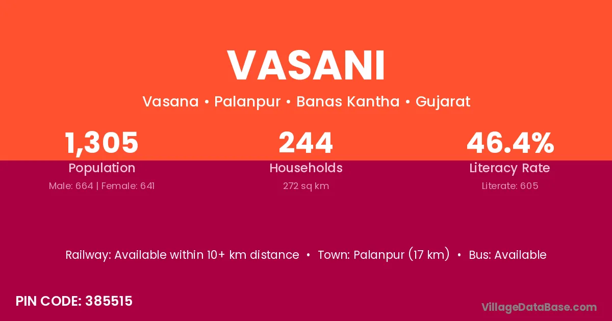 Himatnagar (20 km) is the nearest town to Vasani village for major economic activities and is located approximately 20 km away.