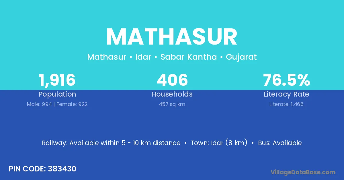 Idar (8 km) is the nearest town to Mathasur village for major economic activities and is located approximately 8 km away.