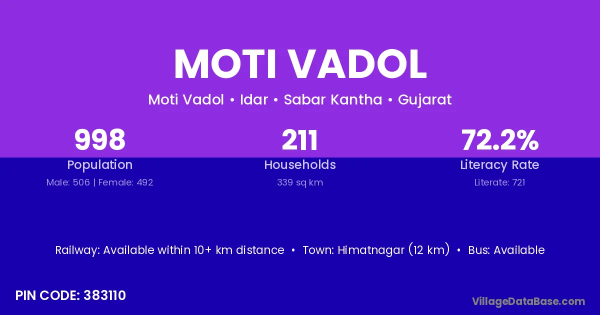 Himatnagar (12 km) is the nearest town to Moti Vadol village for major economic activities and is located approximately 12 km away.