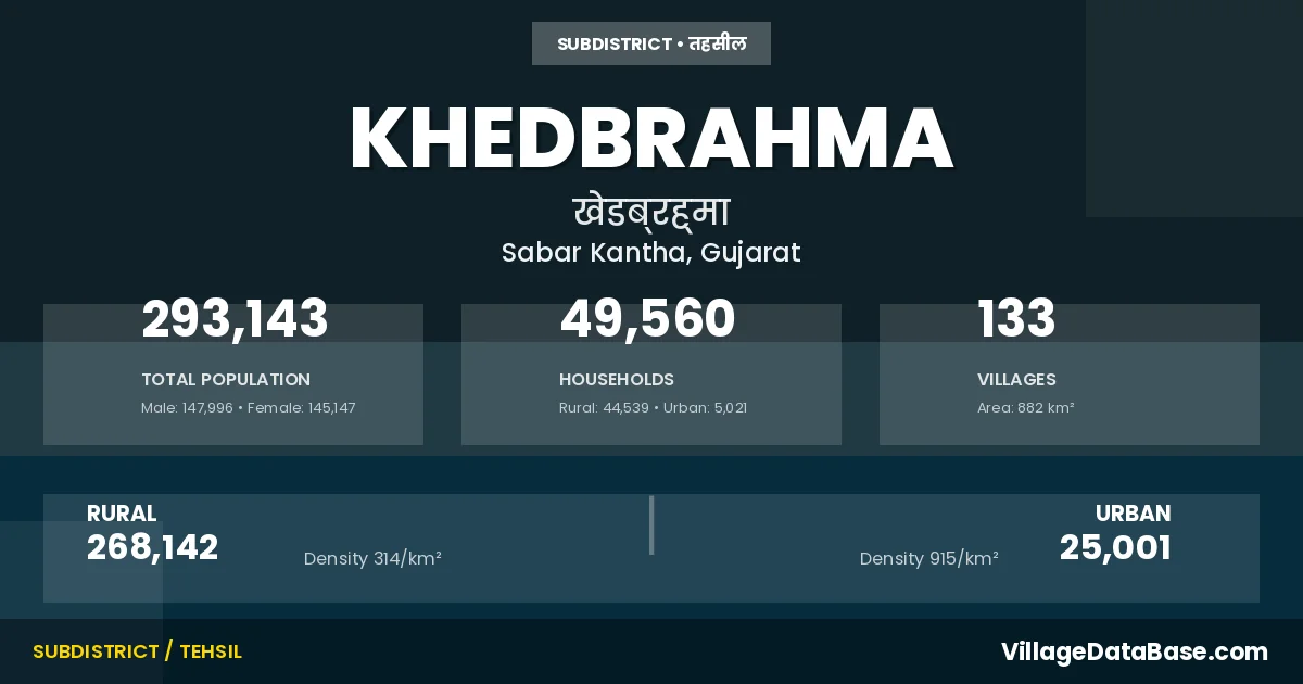 According to the 2011 census The total area of Khedbrahma Taluka is 882 km², with a population of 293143 people. The population density is 332 inhabitants per square kilometre, and there are approximately 49560 houses in the sub district.