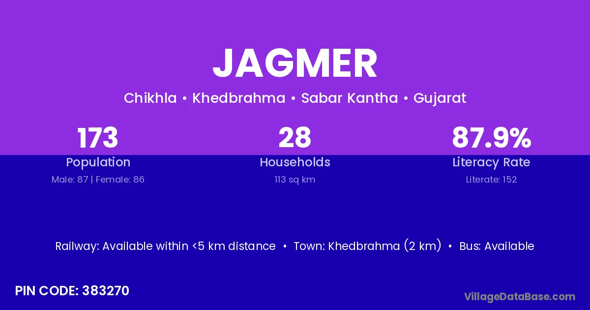 Khedbrahma (2 km) is the nearest town to Jagmer village for major economic activities and is located approximately 2 km away.