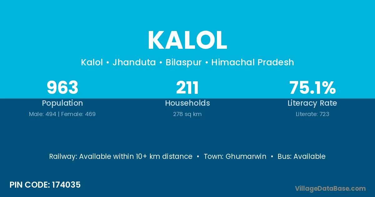 The literacy rate of Kalol village is 56.30%. Male literacy stands at 68.14% and female literacy at 44.17%.