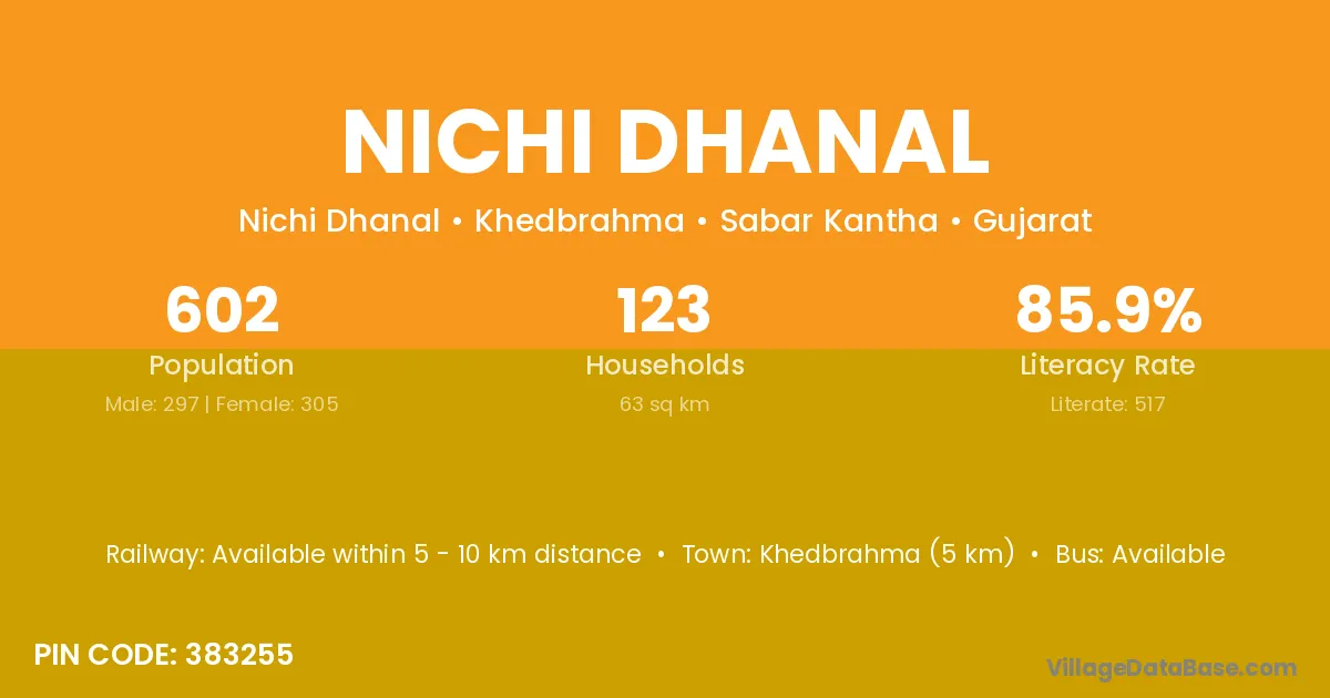 Khedbrahma (5 km) is the nearest town to Nichi Dhanal village for major economic activities and is located approximately 5 km away.