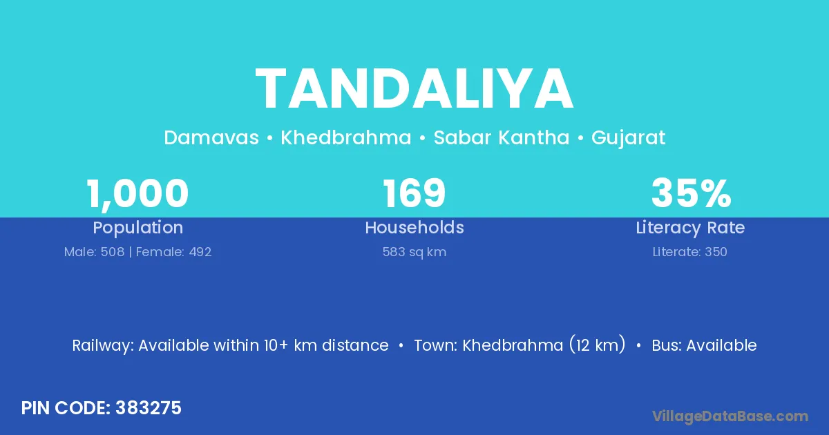 Khedbrahma (12 km) is the nearest town to Tandaliya village for major economic activities and is located approximately 12 km away.