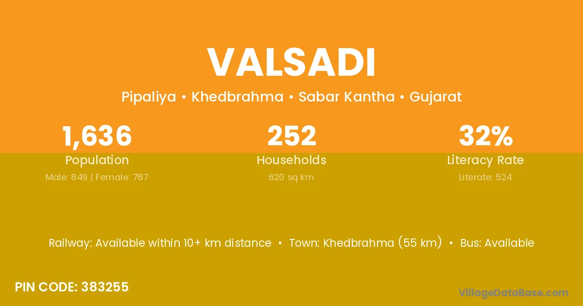 Khedbrahma (55 km) is the nearest town to Valsadi village for major economic activities and is located approximately 55 km away.