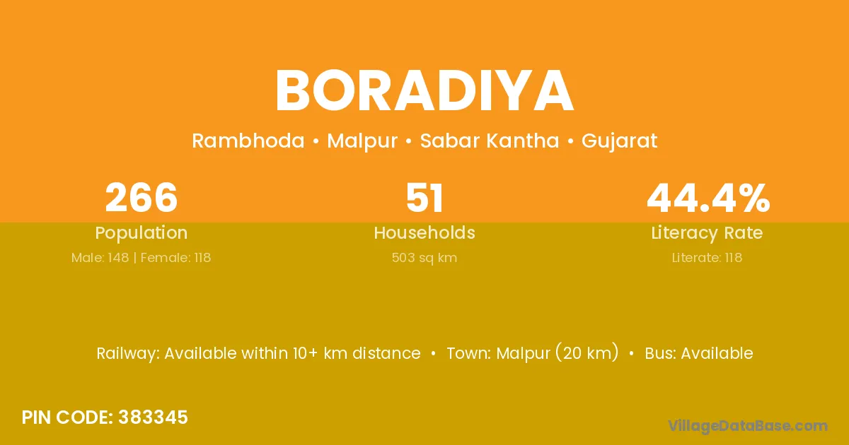 Malpur (20 km) is the nearest town to Boradiya village for major economic activities and is located approximately 20 km away.