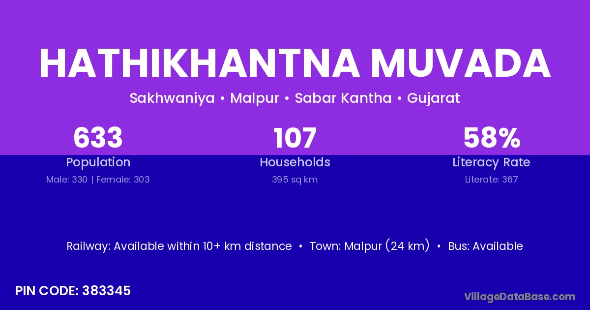 Hathikhantna Muvada village has a total population of 633 people, of which 330 are males and 303 are females.