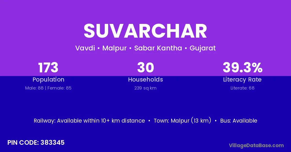 Malpur (13 km) is the nearest town to Suvarchar village for major economic activities and is located approximately 13 km away.