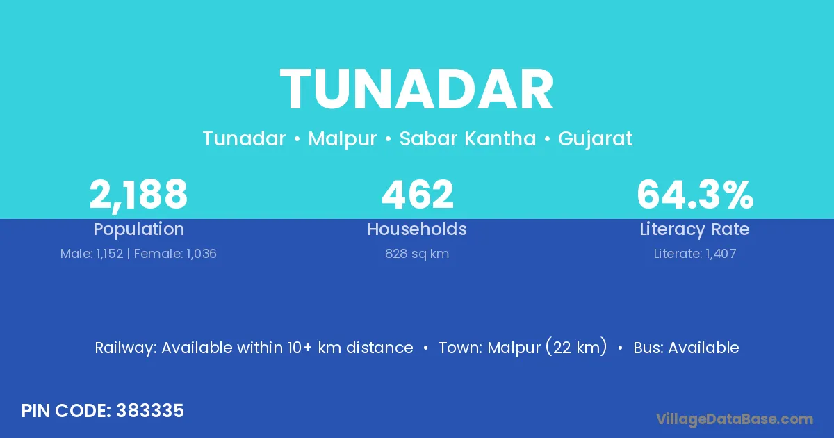 Malpur (22 km) is the nearest town to Tunadar village for major economic activities and is located approximately 22 km away.