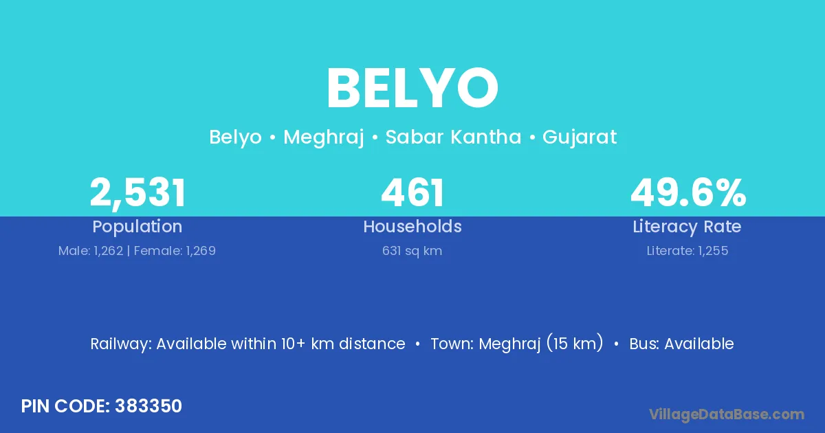 Belyo village has a total population of 2,531 people, of which 1,262 are males and 1,269 are females.