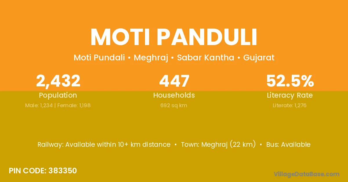 Meghraj (22 km) is the nearest town to Moti Panduli village for major economic activities and is located approximately 22 km away.