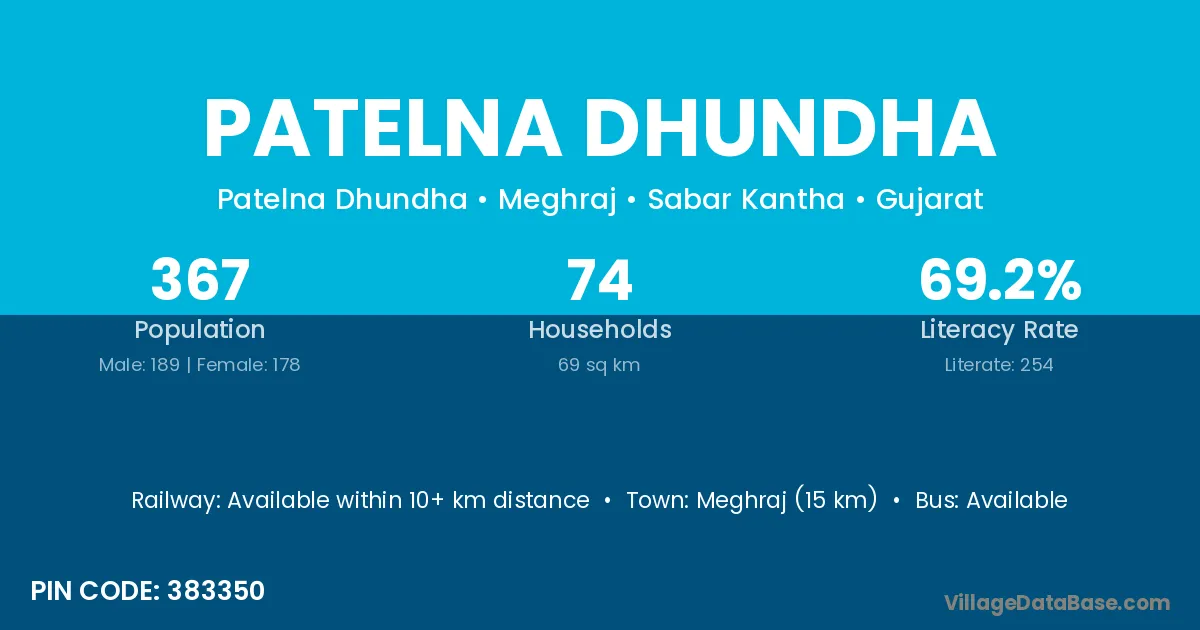 Meghraj (15 km) is the nearest town to Patelna Dhundha village for major economic activities and is located approximately 15 km away.