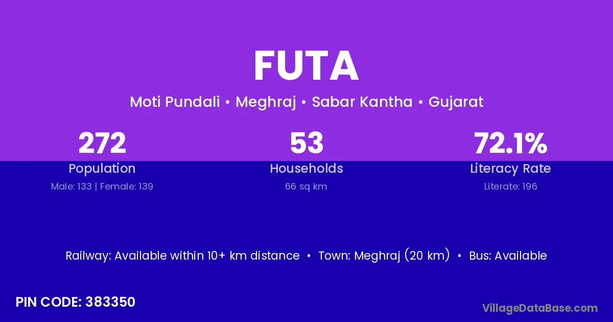 Modasa (14 km) is the nearest town to Futa village for major economic activities and is located approximately 14 km away.