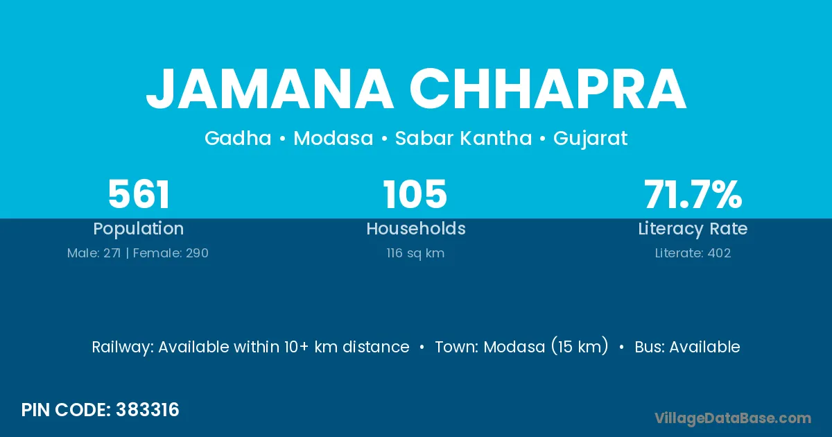 Modasa (15 km) is the nearest town to Jamana Chhapra village for major economic activities and is located approximately 15 km away.