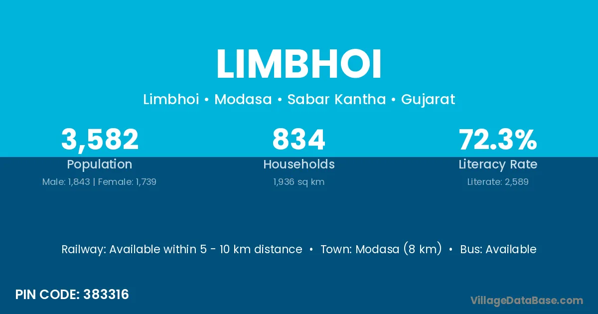 Modasa (8 km) is the nearest town to Limbhoi village for major economic activities and is located approximately 8 km away.