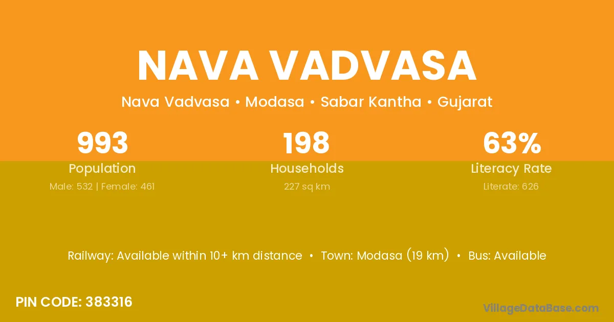 Modasa (19 km) is the nearest town to Nava Vadvasa village for major economic activities and is located approximately 19 km away.