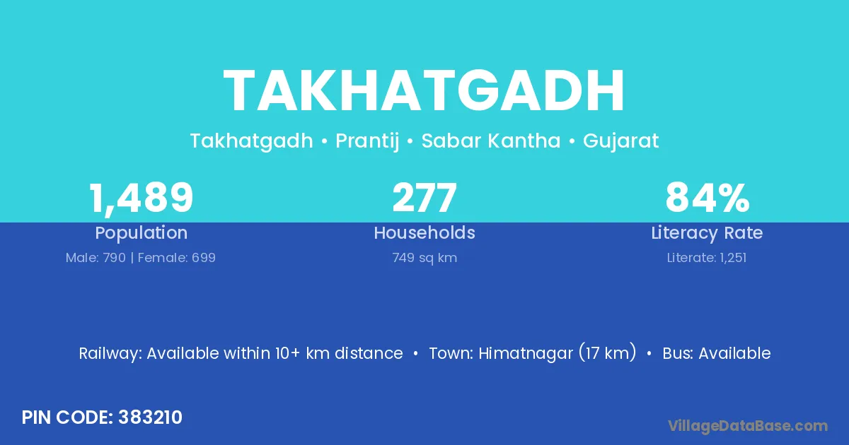 Himatnagar (17 km) is the nearest town to Takhatgadh village for major economic activities and is located approximately 17 km away.