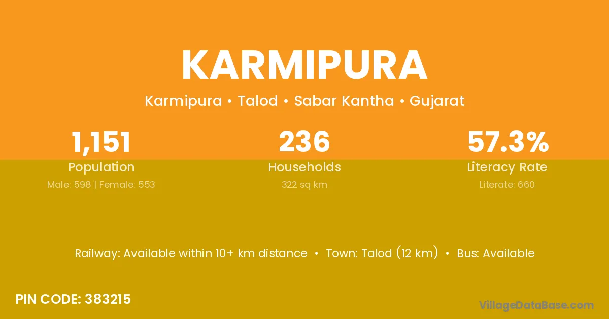 Talod (12 km) is the nearest town to Karmipura village for major economic activities and is located approximately 12 km away.