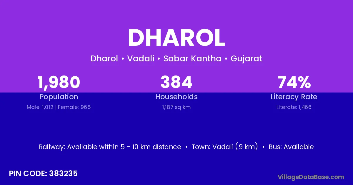 Vadali (9 km) is the nearest town to Dharol village for major economic activities and is located approximately 9 km away.