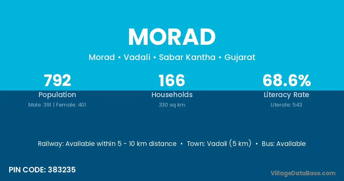 Vadali (5 km) is the nearest town to Morad village for major economic activities and is located approximately 5 km away.