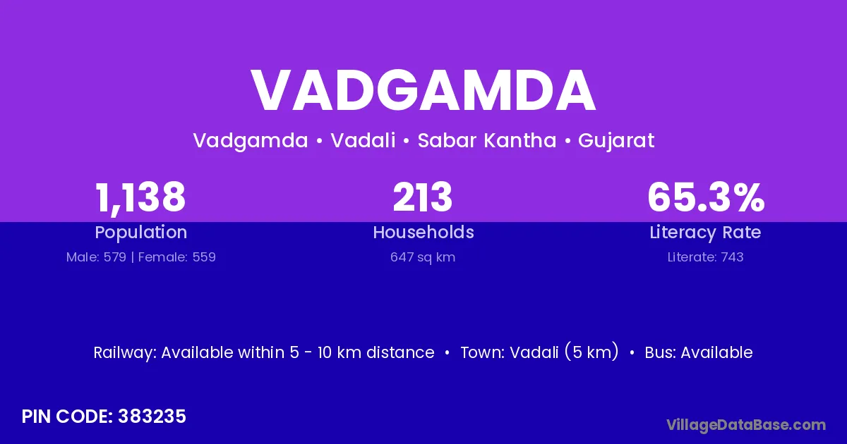 Vadali (5 km) is the nearest town to Vadgamda village for major economic activities and is located approximately 5 km away.