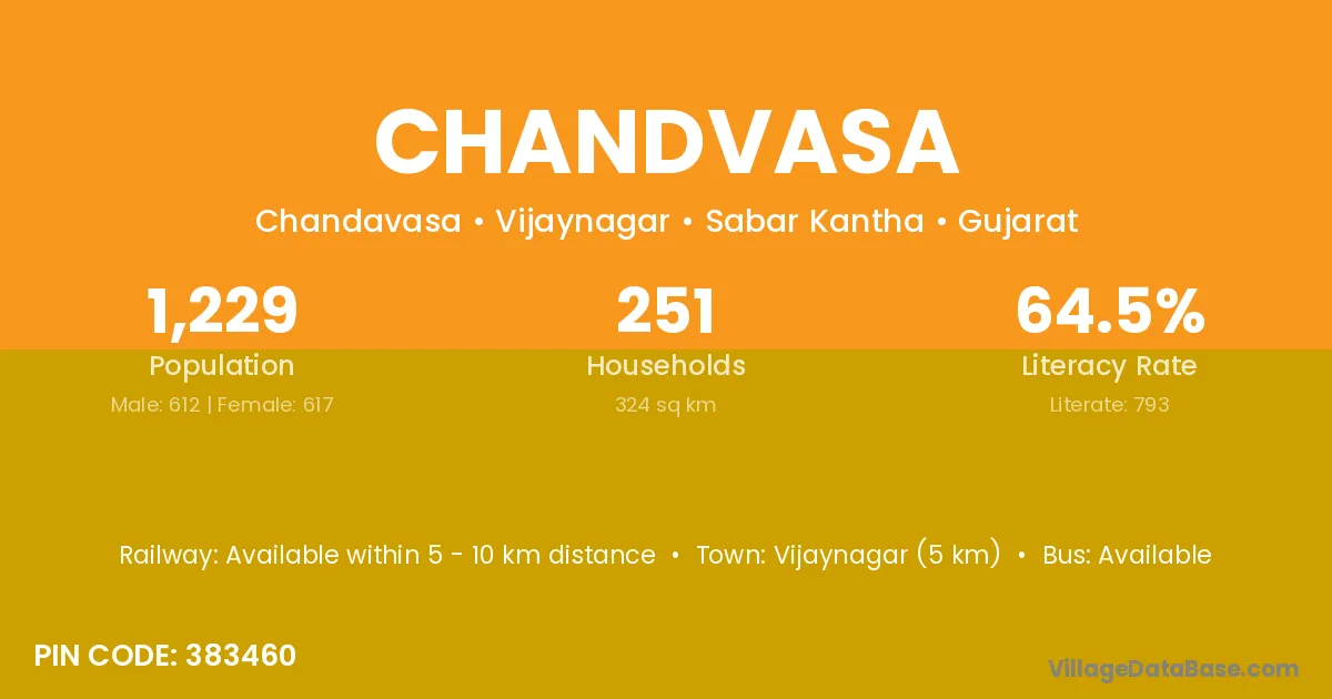 Chandvasa village has a total population of 1,229 people, of which 612 are males and 617 are females.