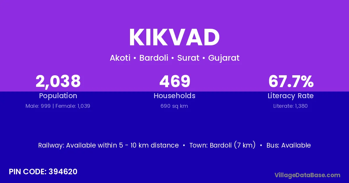 Bardoli (7 km) is the nearest town to Kikvad village for major economic activities and is located approximately 7 km away.