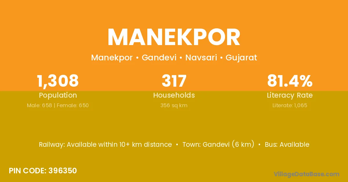 Bardoli (18 km) is the nearest town to Manekpor village for major economic activities and is located approximately 18 km away.
