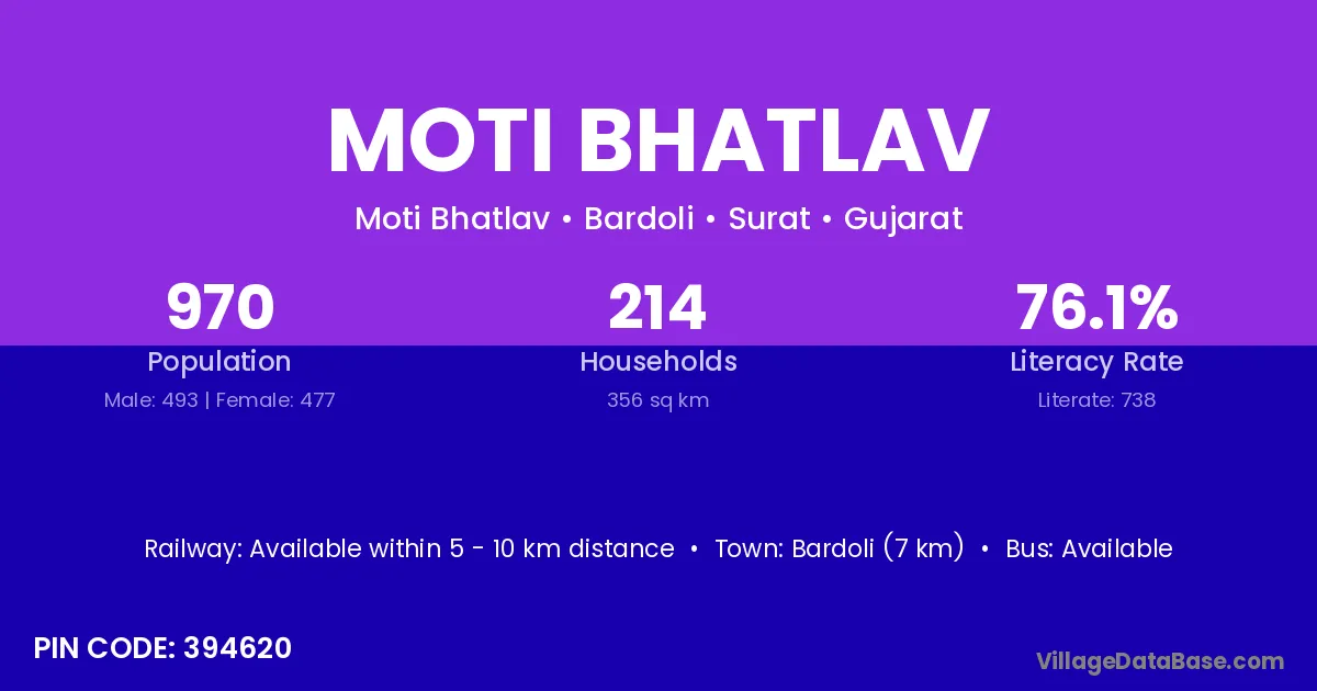 Bardoli (7 km) is the nearest town to Moti Bhatlav village for major economic activities and is located approximately 7 km away.