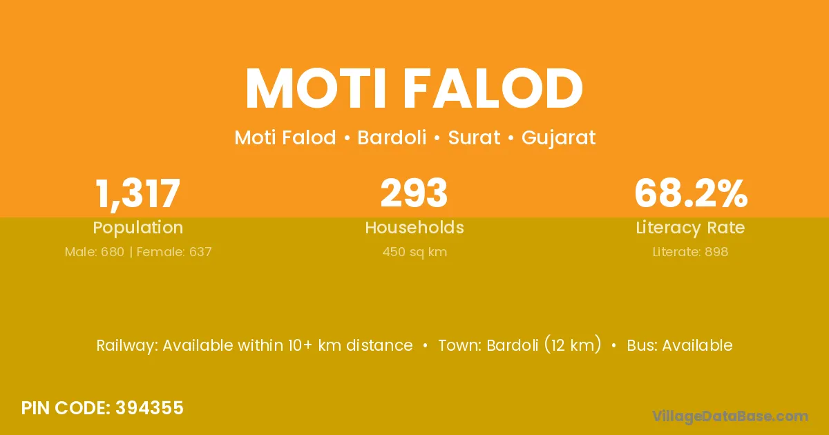 Bardoli (12 km) is the nearest town to Moti Falod village for major economic activities and is located approximately 12 km away.