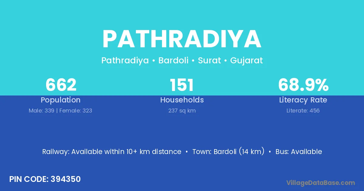 Bardoli (14 km) is the nearest town to Pathradiya village for major economic activities and is located approximately 14 km away.