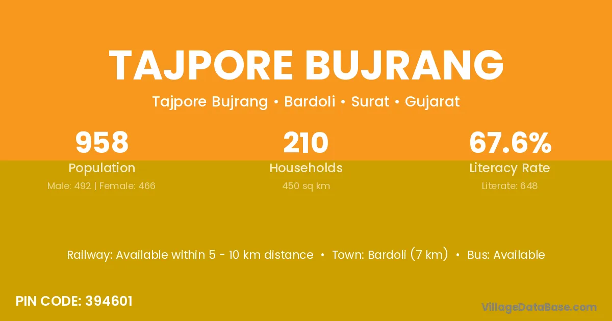 Bardoli (7 km) is the nearest town to Tajpore Bujrang village for major economic activities and is located approximately 7 km away.