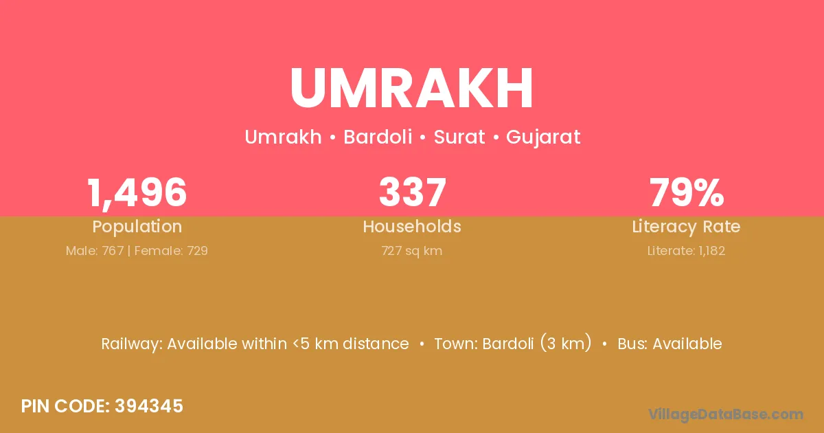 Bardoli (3 km) is the nearest town to Umrakh village for major economic activities and is located approximately 3 km away.