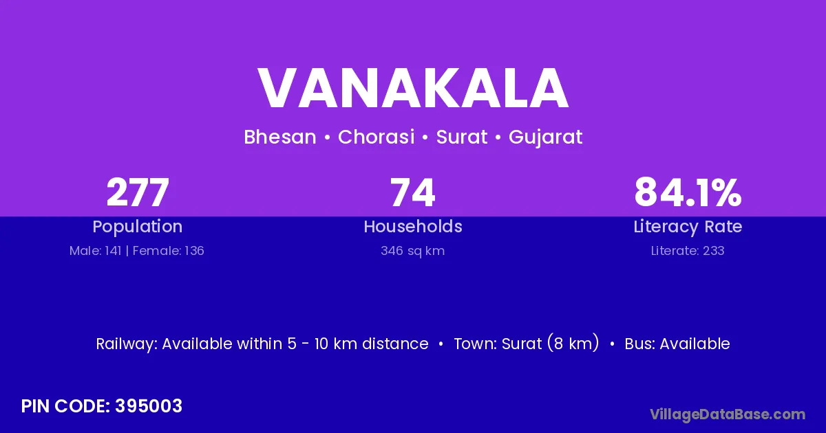 Surat (8 km) is the nearest town to Vanakala village for major economic activities and is located approximately 8 km away.