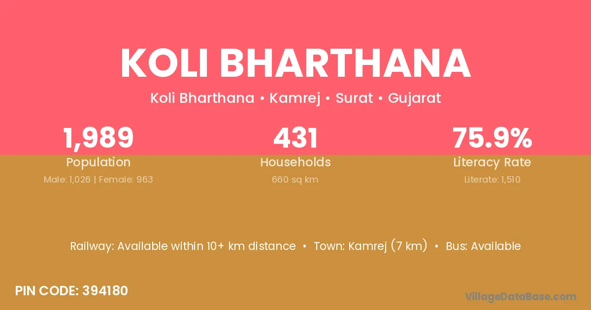 Kamrej (7 km) is the nearest town to Koli Bharthana village for major economic activities and is located approximately 7 km away.