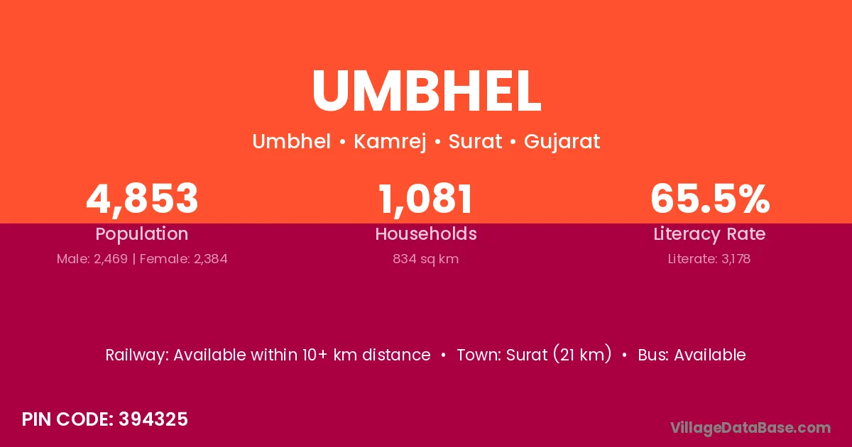 Surat (21 km) is the nearest town to Umbhel village for major economic activities and is located approximately 21 km away.