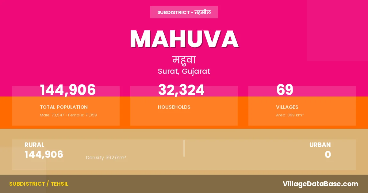 According to the 2011 census The total area of Mahuva Taluka is 369 km², with a population of 144906 people. The population density is 392 inhabitants per square kilometre, and there are approximately 32324 houses in the sub district.